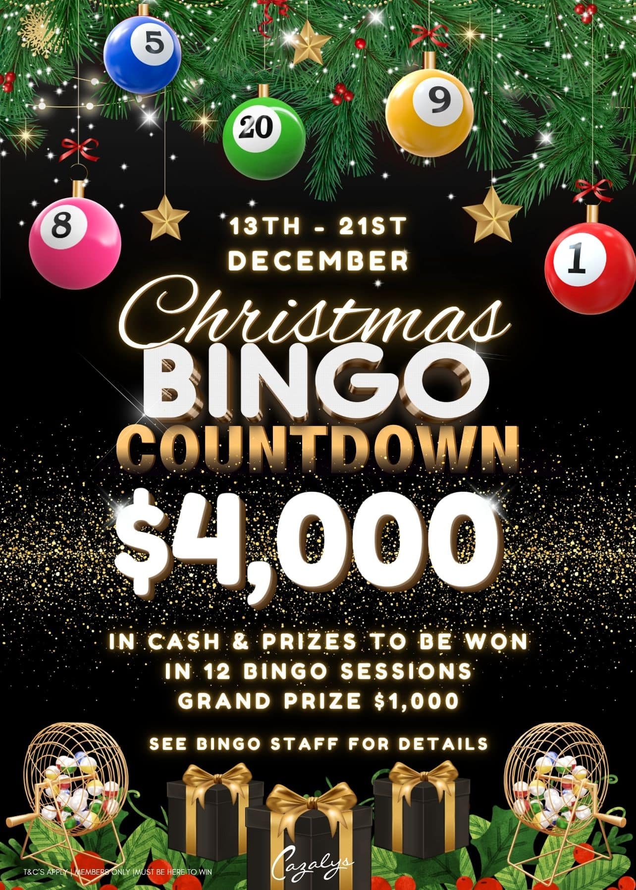 Play at any of our weekly bingo sessions during our Christmas Countdown for your chance to win a share of our bonus $4,000 in cash and prizes. Grand prize is $1,000 in CASH!