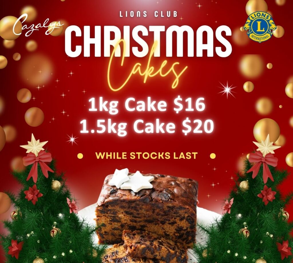 Proudly supporting our local community groups, Cazalys has the delicious LIONS XMAS CAKES on sale at reception! 1KG are $16 and the 1.5KG are only $20 – while stocks last….