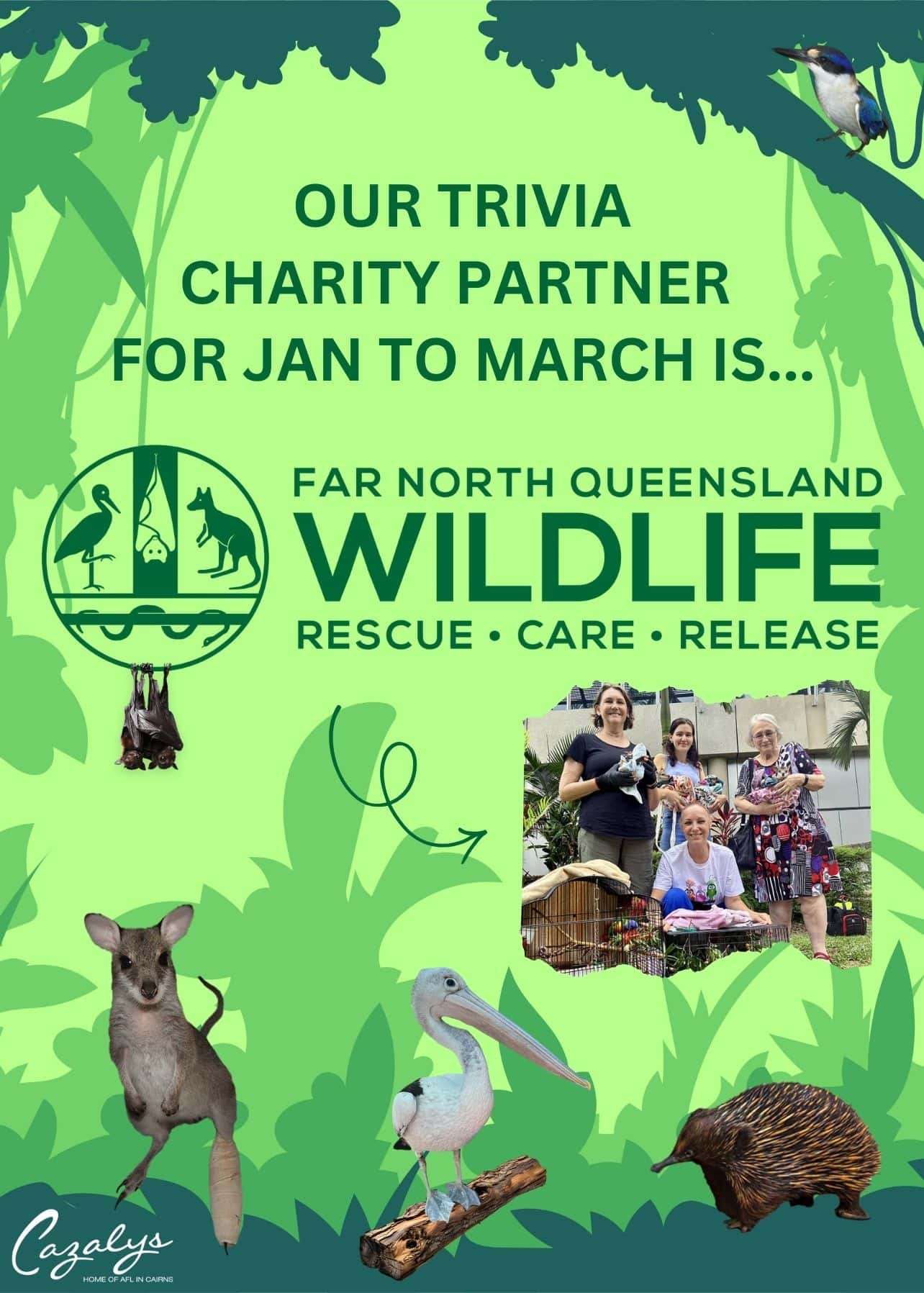 Cazalys is proud to support FNQ Wildlife Rescue for January to March 2026. FNQ Wildlife Rescue is an independent, not-for-profit, volunteer organisation that rescues, cares for, and releases native wildlife from Cardwell up to Cape York. FNQWR’s committed members have saved thousands of sick, injured & orphaned wildlife since its founding in 1994. They are well known for their 24/7 phone rescue service – 07 4053 4467 – which handles 5,000 calls a year!