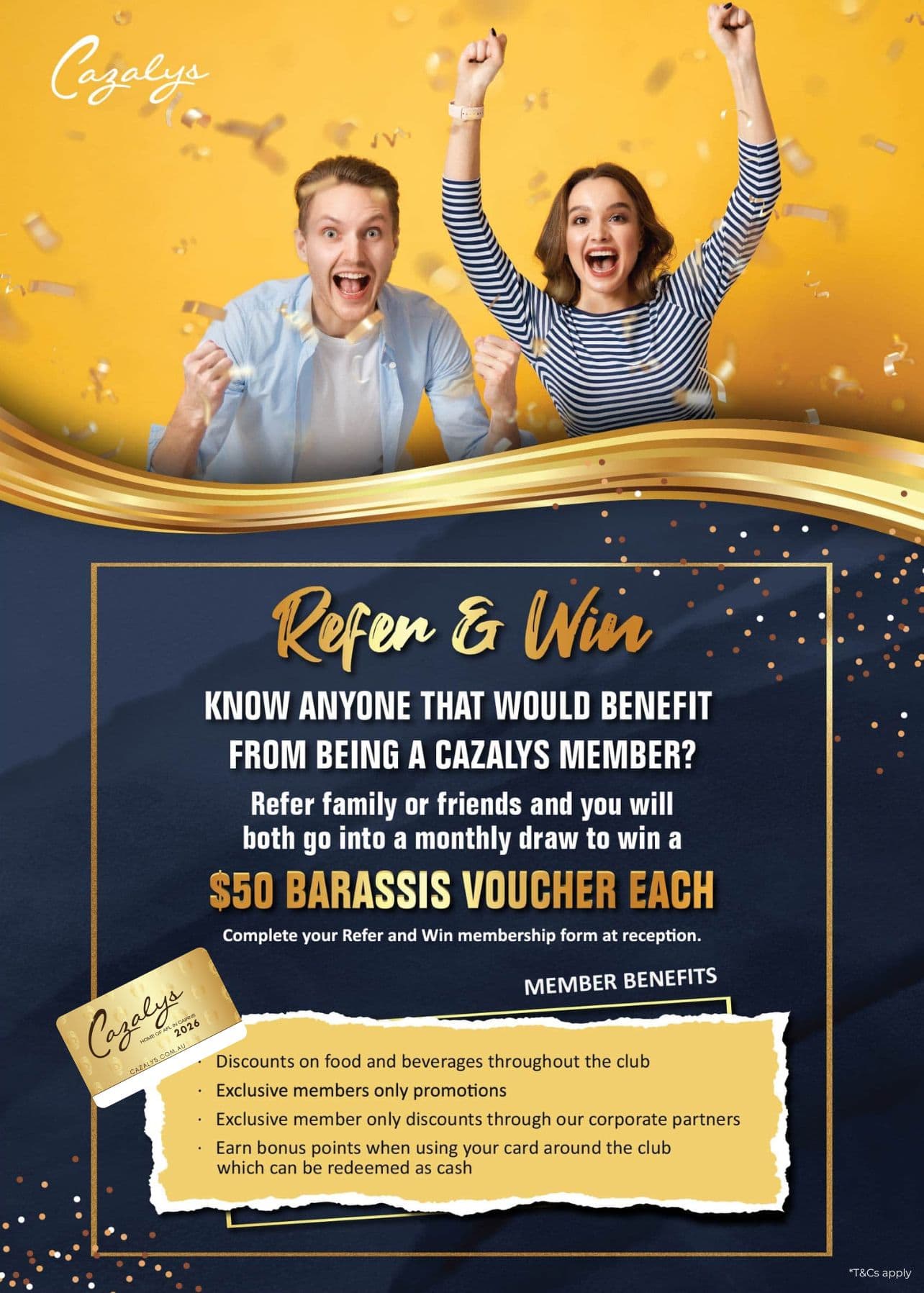 Simply refer your friends or family and if they become a Cazalys member you will both be eligible for our monthly $50 Barassis voucher draw.