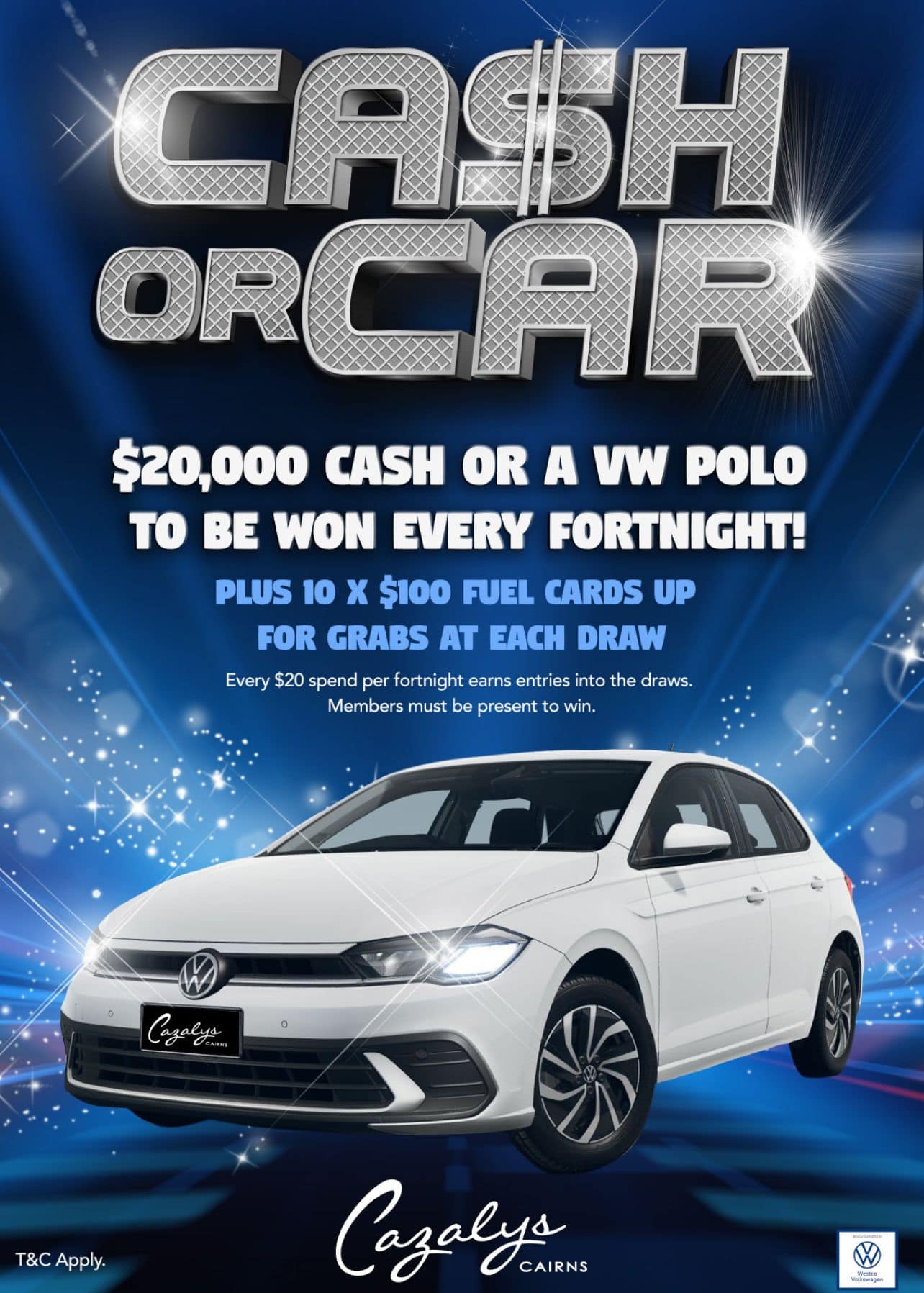 Earn entries into the draws for every $10 turnover on gaming and every $5 spend at the bars, cafe, restaurant, bottles hop or bingo at Cazalys.