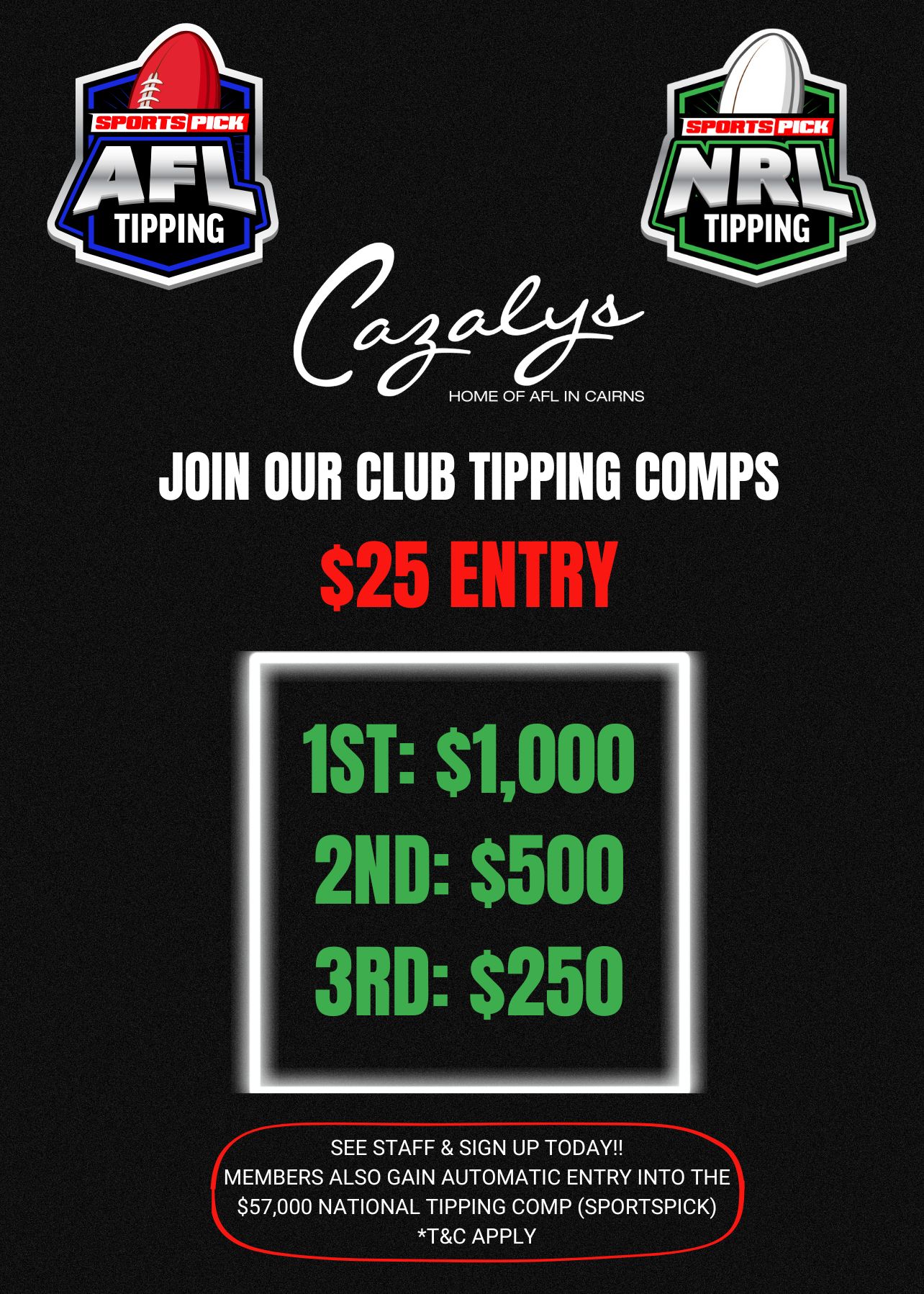 $25 entry into each code – automatic entry into Local and National Tipping Comp!