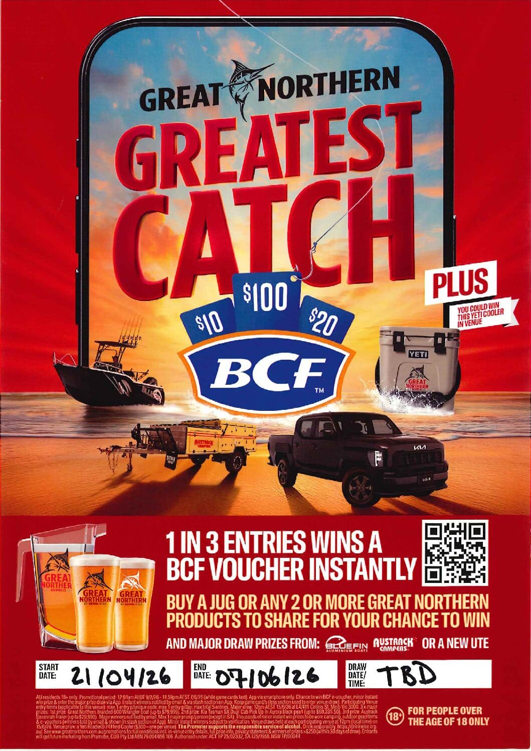 Purchase any two Great Northern products or a jug to earn an entry. Two ways to win! Instant win digital prizes available through the Great Northern app + every game card has an entry to win a Great Northern branded esky.