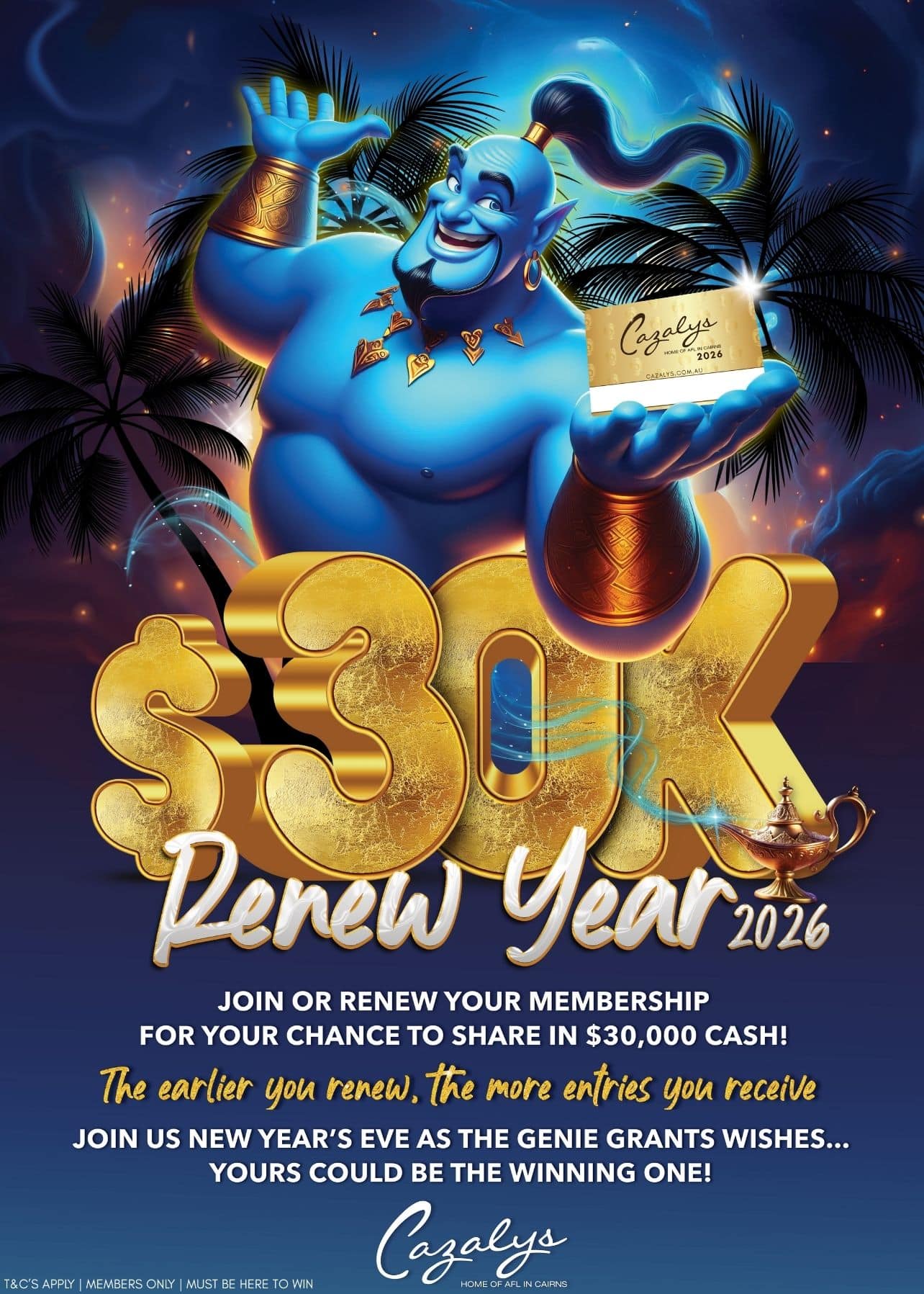 Description : JOIN OR RENEW TO WIN ON NYE! $30,000 in CASH prizes on offer this NYE! Join or renew your Cazalys membership for $2 for your chance to share in $30,000...
