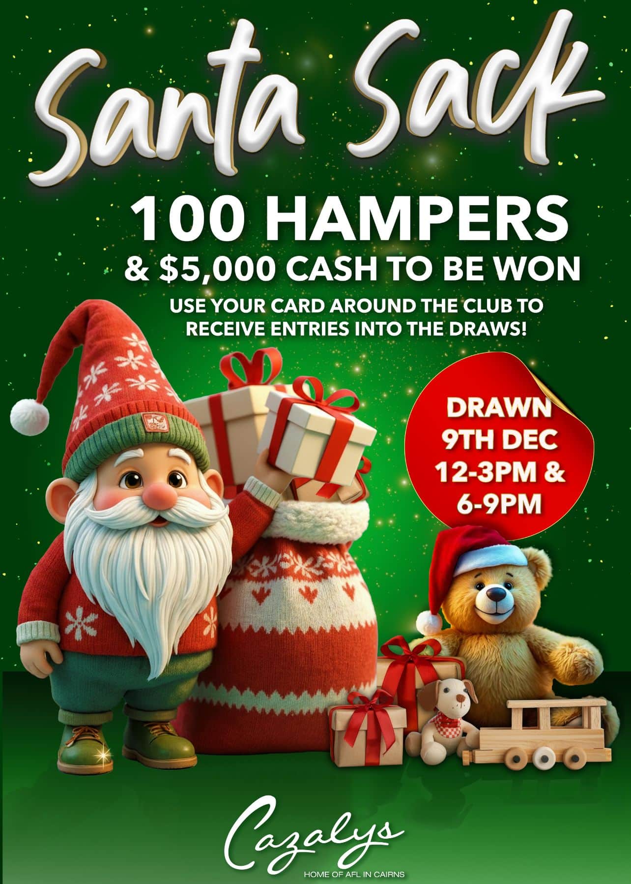 Description : TUESDAY DECEMBER 9TH 12pm-3pm & 6pm-9pm Cazalys is celebrating Christmas with 100 Hampers and $5,000 in cash prizes to be won. Use your membership card around the club for entries...