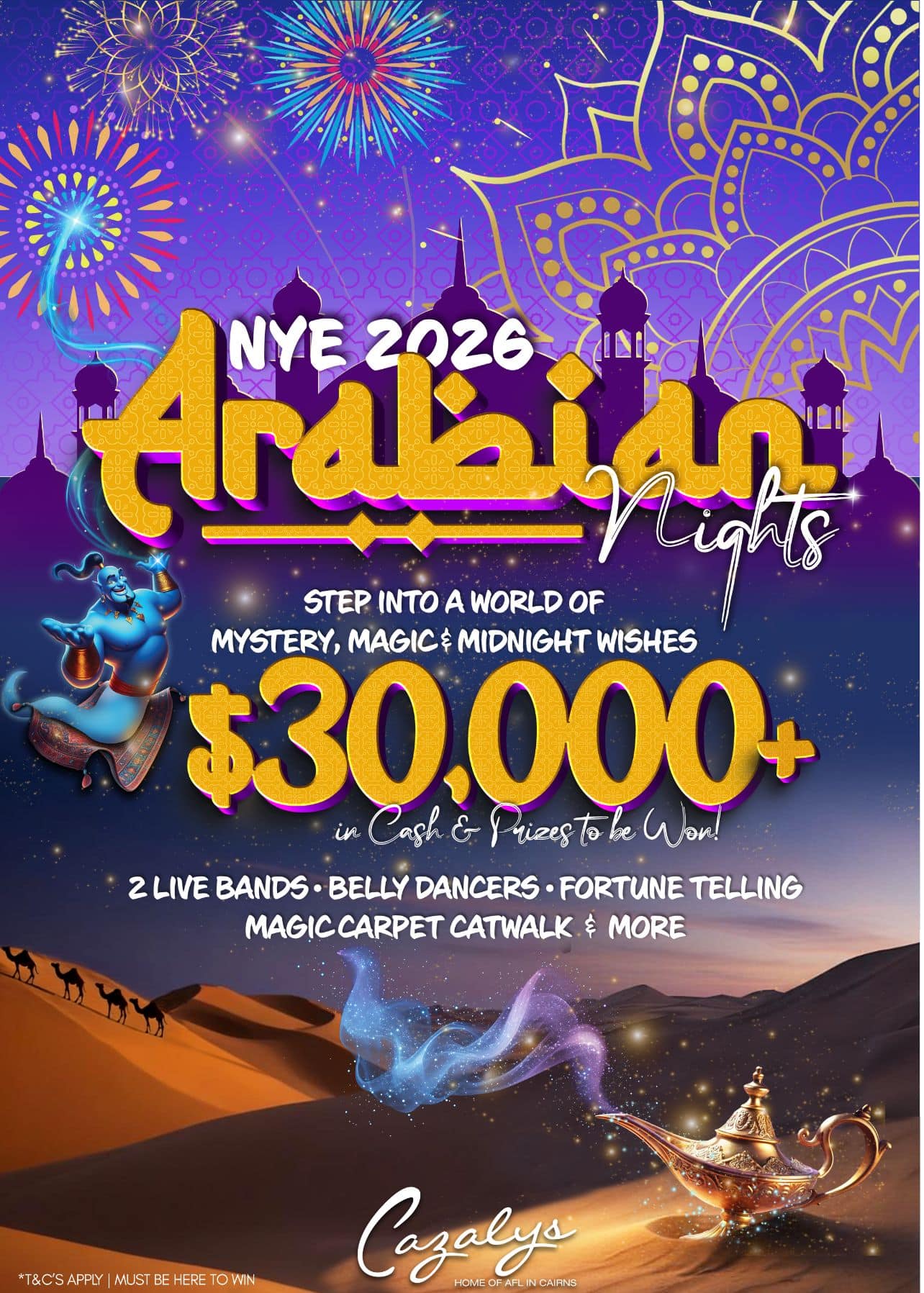 Description : NYE 2026 ARABIAN NIGHTS Step into a world of mystery, magic, and midnight wishes as we ring in the New Year in true Arabian style — only at Cazalys! $30,000...