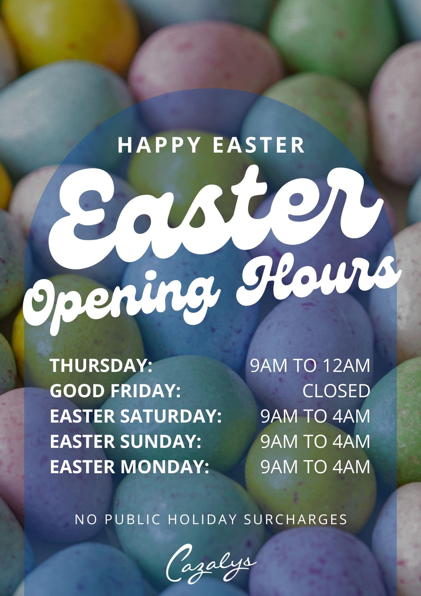 Description : In line with liquor and gaming laws, Cazalys will be closing at 12am on Thursday April 2nd and reopening on Saturday April 4th at 9am. We are open Easter Saturday,...